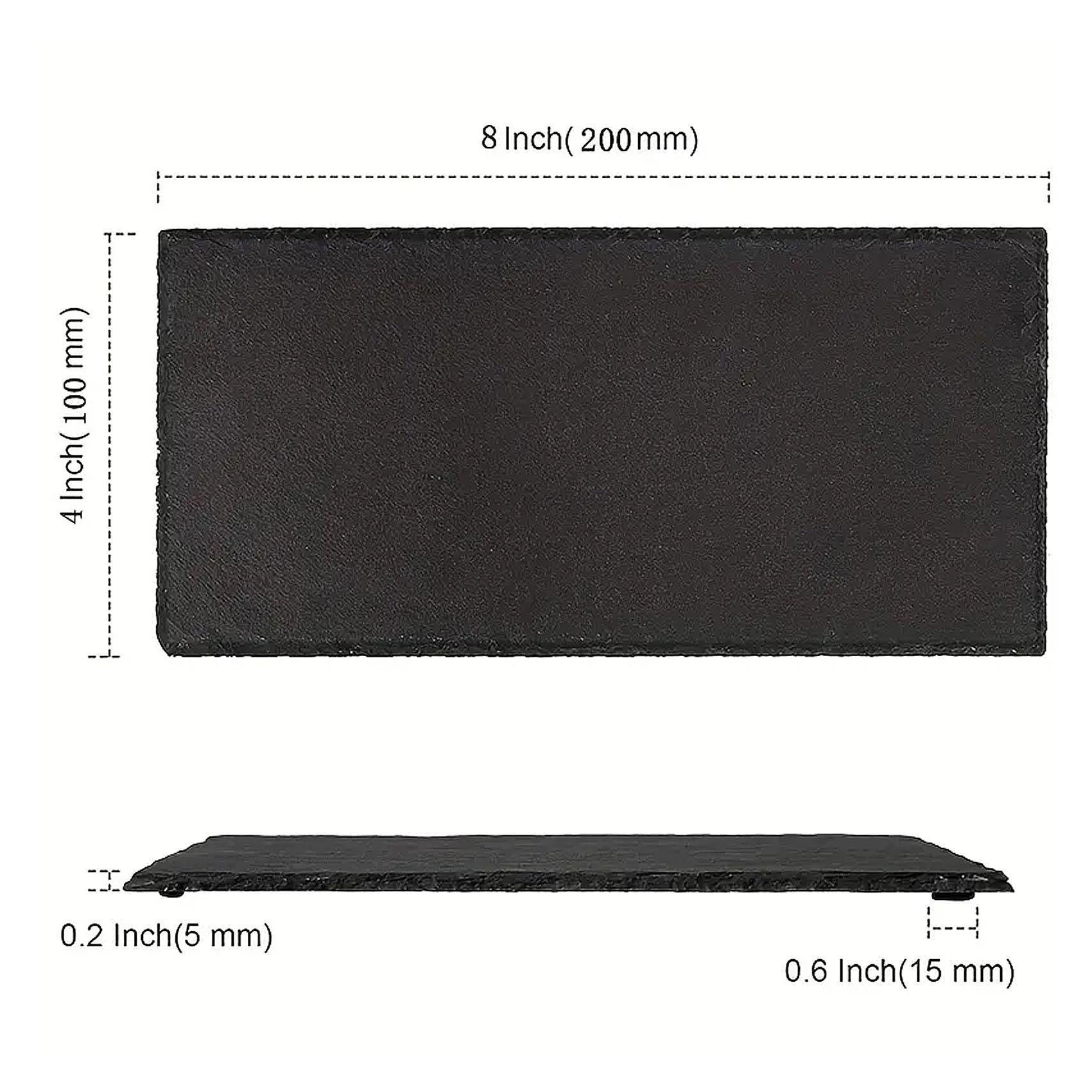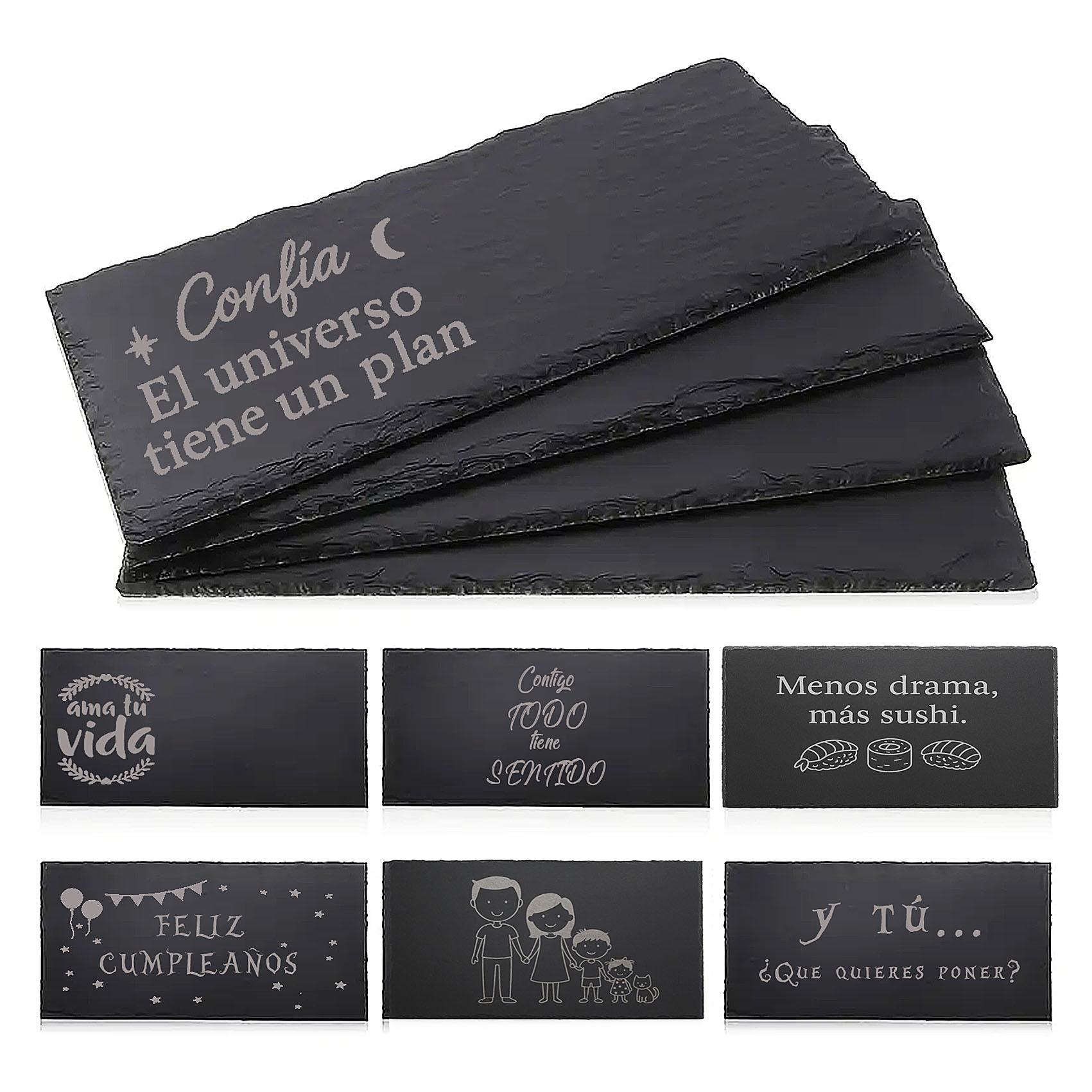 Cada pieza está fabricada en pizarra natural de 20×10 cm y 5 mm de grosor, con grabado láser de precisión y diseño personalizable.