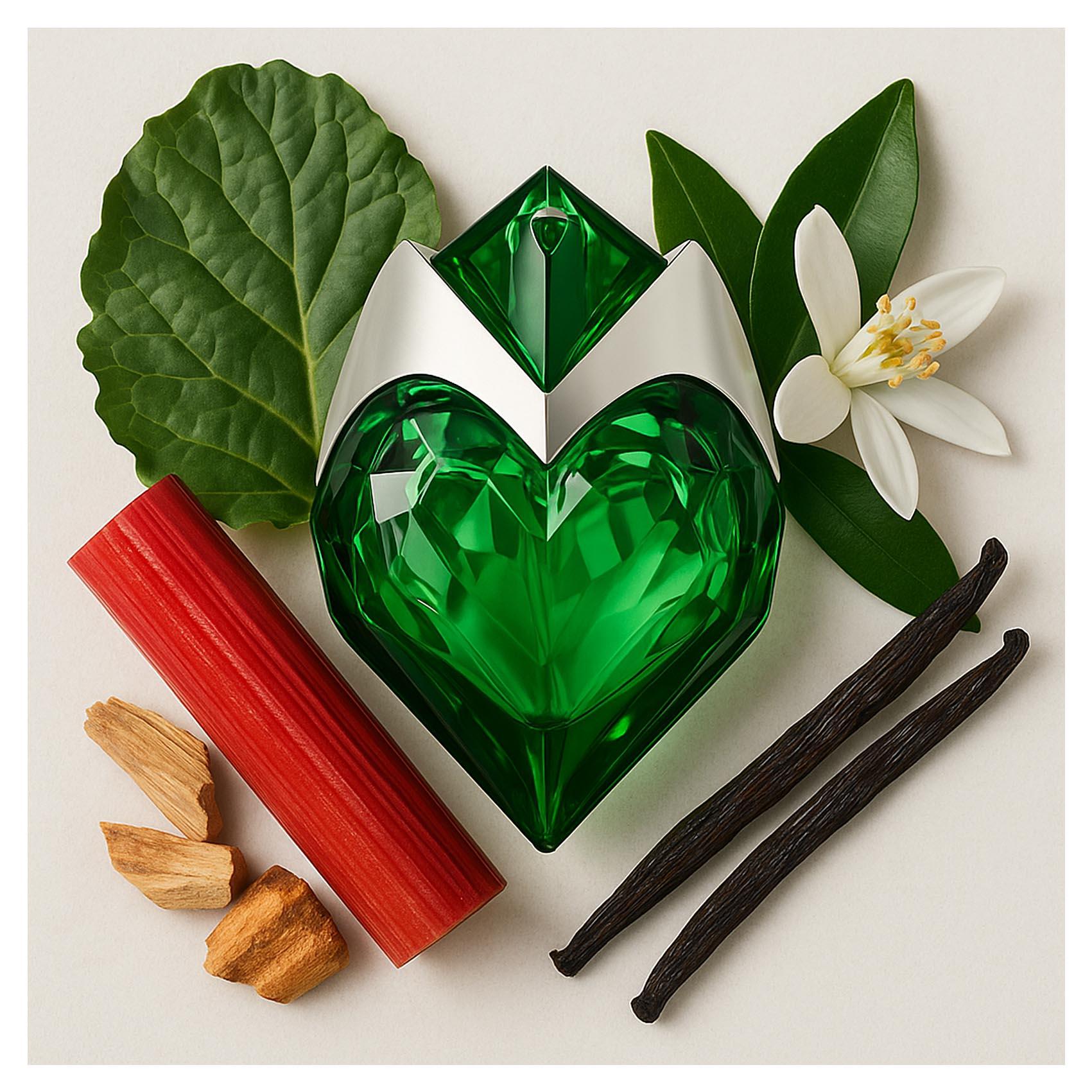Su apertura verde de hojas de ruibarbo despierta los sentidos, seguida de un corazón de flor de azahar del naranjo que aporta dulzura y equilibrio. En el fondo, la vainilla Bourbon se funde con las notas amaderadas, creando una estela profunda, cálida y adictiva.