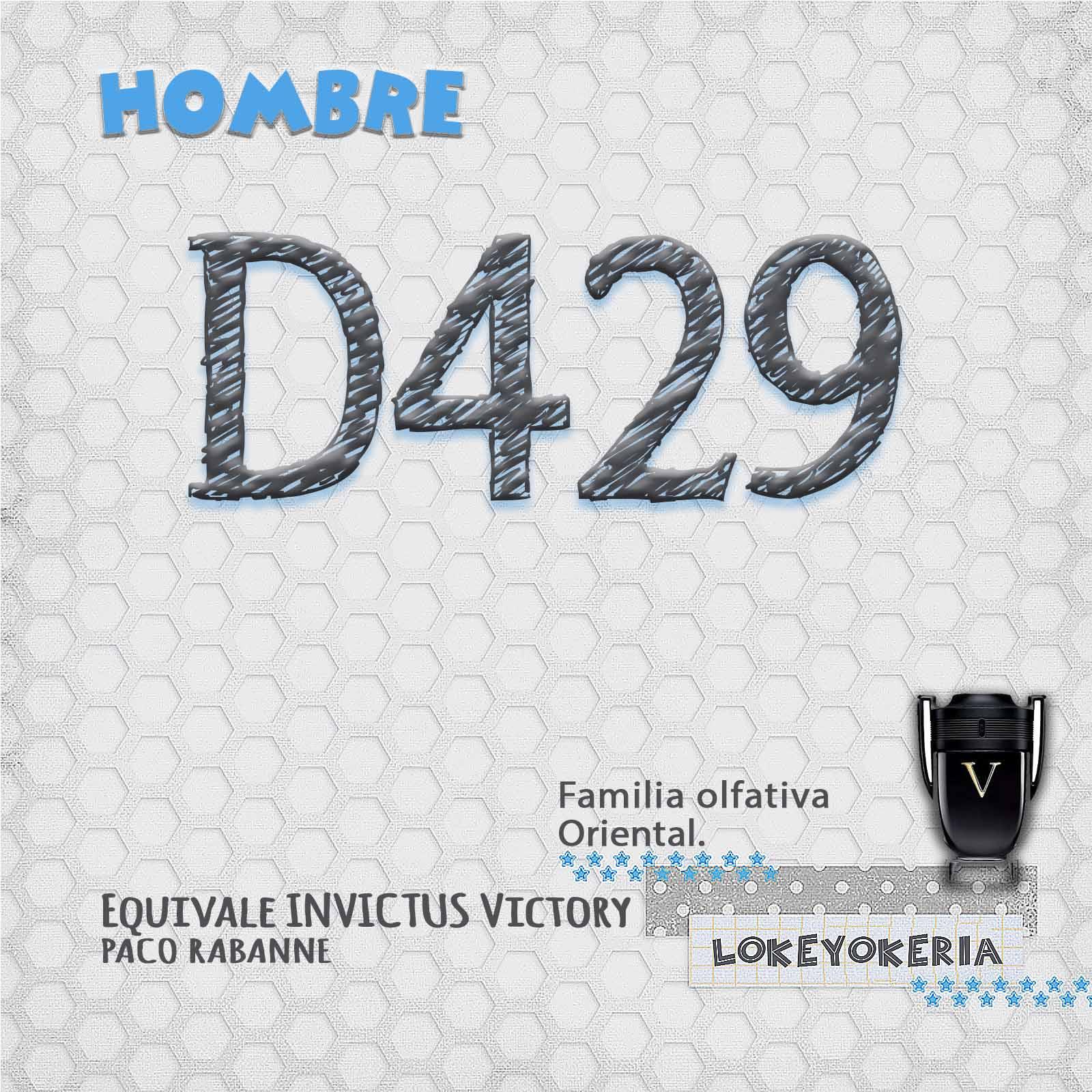 D429 es un perfume de equivalencia para hombre con un carácter intenso, seductor y muy actual. Una fragancia oriental pensada para hombres seguros, con presencia y estilo, que buscan un aroma potente y envolvente que no pase desapercibido.