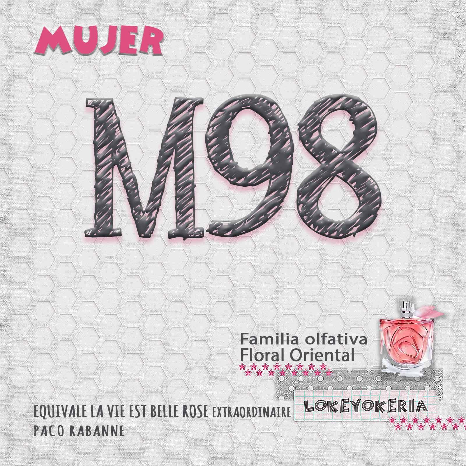 M98 es un perfume de equivalencia para mujer elegante, femenino y delicadamente sofisticado, perteneciente a la familia floral oriental. Una fragancia pensada para mujeres que aman los aromas florales refinados, con presencia pero sin exceso, y que buscan un perfume especial para sentirse femeninas y seguras.